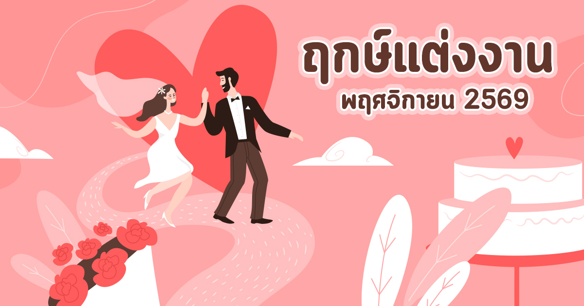 ฤกษ์แต่งงานพฤศจิกายน 2569 คู่รักที่กำลังวางแผนจะแต่งงาน จะมีวันไหนบ้างที่เป็นฤกษ์ดี ฤกษ์มงคล เหมาะสำหรับเริ่มต้นชีวิตคู่ มาดูกัน ความเชื่อในเรื่องของฤกษ์งามยามดีอยู่คู่กับคนไทยมาตั้งแต่โบราณ หลายคนหาฤกษ์ดี ฤกษ์มงคล สำหรับจัดงานสำคัญต่าง ๆ โดยเฉพาะอย่างยิ่งงานแต่งงานที่ต้องหาฤกษ์ดิถีเรียงหมอน เพื่อเสริมสิริมงคลให้กับชีวิตคู่ และเชื่อกันว่าจะทำให้ความรักยืนยาว สำหรับคู่รักที่มองหาฤกษ์แต่งงานอยู่ กระปุกดอทคอมได้รวบรวมฤกษ์แต่งงานพฤศจิกายน 2569 จากเว็บไซต์ weddinglist.co.th มาฝากกันแล้ว เช็กกันเลยว่ามีวันไหนที่เหมาะสมบ้าง วันอังคารที่ 3 พฤศจิกายน 2569 วันพฤหัสบดีที่ 5 พฤศจิกายน 2569 วันจันทร์ที่ 9 พฤศจิกายน 2569 วันจันทร์ที่ 16 พฤศจิกายน 2569 วันพฤหัสบดีที่ 19 พฤศจิกายน 2569 วันอาทิตย์ที่ 22 พฤศจิกายน 2569 วันเสาร์ที่ 28 พฤศจิกายน 2569 ฤกษ์แต่งงานเหล่านี้เป็นเพียงแนวทางเท่านั้น หากต้องการจัดงานแต่งงานให้เข้ากับดวงของคู่บ่าวสาวมากที่สุด ให้นำวัน เดือน ปีเกิด ของทั้งคู่ไปหาฤกษ์ดีแบบเฉพาะเจาะจงอีกครั้งหนึ่ง หรือถ้าใครอยากยึดฤกษ์สะดวกก็ไม่ใช่เรื่องผิด สิ่งสำคัญคือควรเตรียมงานแต่เนิ่น ๆ เพื่อให้ออกมาสมบูรณ์แบบ สีมงคล 2569 เช็กสีมงคลประจำวัน เสริมดวงให้ยิ่งเฮงตลอดปี ฤกษ์ออกรถ 2569 เปิดตารางวันมงคล ออกรถแล้วรุ่ง เสริมโชคการเงิน การงาน ฮวงจุ้ยบ้าน 2569 ปีมะเมีย วิธีจัดบ้านรับโชคและความสำเร็จ ขอบคุณข้อมูลจาก : weddinglist.co.th