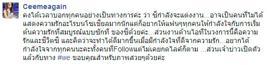 ส่วนงานด้านไอทีในวงการนี้คือความรักและชีวิตซี และคิดว่าจะทำได้ดีมากขึ้นเมื่อมีกำลังใจที่ดีจากความรัก อยากได้กำลังใจจากทุกคนนะคะ ทั้งคนที่ Follow แต่ไม่เคยกดไลค์ ก็ตาม ส่วนเจ้าบ่าวเปิดตัวแล้วกับทาง #we ขอบคุณสำหรับภาพสวย ๆ ด้วยค่ะ"