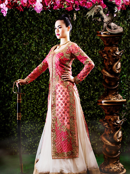 ชุดเจ้าสาวสำหรับสาวแกร่งที่ดูสวยงามและมีอำนาจมากทีเดียว แต่ถึงจะมีกลิ่นอายของนักรบหญิง ชุดเจ้าสาวแบบมู่หลานชุดนี้ก็ยังดูอ่อนหวานแบบผู้หญิงเช่นเดียวกัน โดยเฉพาะช่วงกระโปรงที่ดีไซเนอร์เลือกใช้ผ้าเนื้อบางสีชมพูอ่อนปลาบขอบกระโปรงสีน้ำตาล มาประกบกับเสื้อตัวยาวสีแดงปักดิ้นทอง