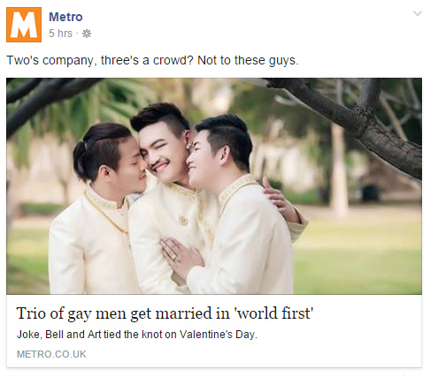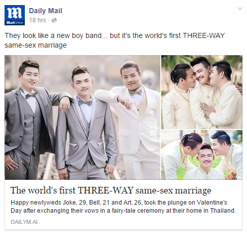 เพิ่งทำให้คนไทยฮือฮากันไปทั้งประเทศเมื่อวันวาเลนไทน์ที่ผ่านมา สำหรับงานแต่ง 3 เกย์ไทย โจ๊ก เบลล์ และอาร์ท ที่มีการ์ดแต่งงานที่แสนจะเก๋และแหวกแนวแชร์ทั่วโลกโซเชียล ล่าสุดก็ดังไกลไปถึงต่างประเทศเลย โดยสื่อนอกเจ้าดังทั้งของอังกฤษและสหรัฐฯ ต่างลงข่าวด้วยความฮือฮาเมื่อวันที่ 27 กุมภาพันธ์ ที่ผ่านมา ปาวประกาศว่านี่คือการแต่งงานระหว่างเพศเดียวกัน 3 คนรวด ครั้งแรกของโลก !!