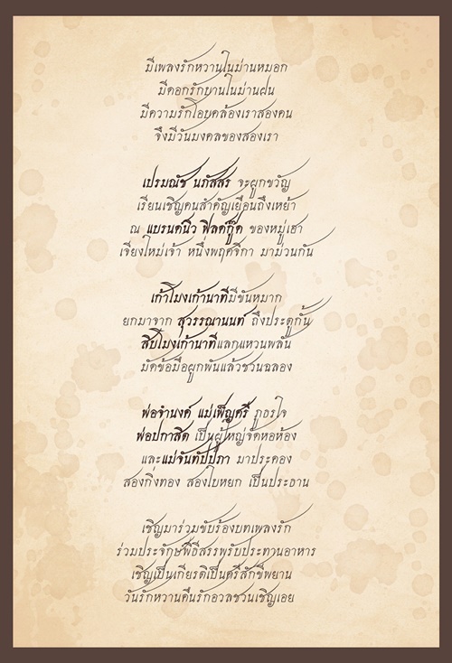 ล่าสุด (10 ตุลาคม 2560) สาวนิว ก็ได้ออกมาเผิดเผยภาพการ์ดงานแต่งงานให้ได้ดูกันแล้ว ซึ่งต้องบอกเลยว่าดีไซน์เก๋ไก๋สุด ๆ กับภาพที่ สาวนิว ใส่ชุดพื้นเมืองของทางเหนือและ หนุ่มเป๊ก มาในชุดหล่อเนี๊ยบ ตามธีมความรักของทั้งคู่ที่ว่าด้วย หนุ่มกรุงเทพฯ จีบสาวเชียงใหม่ พร้อมกันนี้ ยังมีข้อความในการ์ดเชิญก็เรียงร้อยถ้อยคำได้สละสลวยอ่านแล้วเพลินตามาก