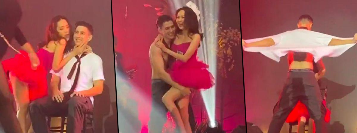 โดยงานนี้ทางเจ้าสาว ปุ้มปุ้ย มาในชุดเดรสสั้นเกาะอกสีแดงแรงฤทธิ์ กับกระโปรงฟูฟ่อง โชว์แดนซ์เลื้อยสุดเซ็กซี่ ขณะที่เจ้าบ่าว หนุ่มกวินท์ ก็มาในชุดเสื้อเชิ้ตสีขาว ผูกเนกไท เต้นเด้ง-ควงเอว เห็นแล้วชวนใจสั่น ก่อนจะฉีกเสื้อต่อหน้าเจ้าสาว เผยให้เห็นกล้ามแน่น ๆ และรอยสัก