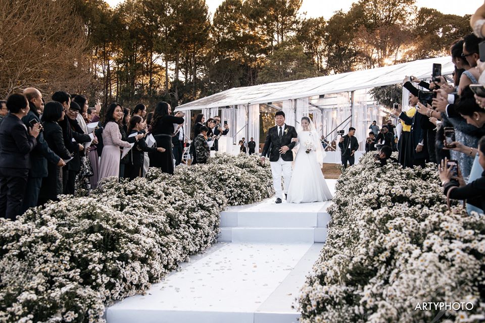 คอนเซ็ปต์งานเป็นการเน้นเรื่องความยิ่งใหญ่ อลังการ ความว้าว แต่ยังคงความสวยเรียบง่าย ไม่ใช่อลังการแล้วเลอะเทอะ แขกภายในงานเดินทางมาไกล เราอยากให้ทุกคนที่มาร่วมแสดงความยินดีกับเจ้าบ่าว-เจ้าสาว รู้สึกว้าวและคุ้มค่ากับการเดินทางมา ซึ่งเก้าอี้ภายในงานแขกจะเหมือนถูกโอบล้อมไปด้วยทุ่งดอกไม้