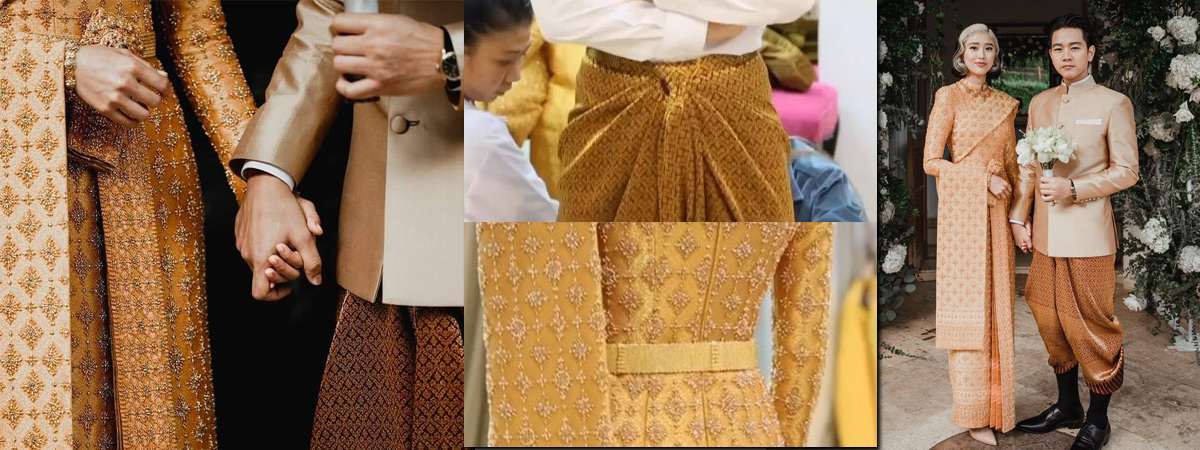 สิ่งที่โดดเด่นมาก ๆ ก็คือ ชุดแต่งงานของคู่บ่าวสาวที่งดงามมาก เป็นผ้าไหมทอมือ ตัดเย็บอย่างประณีตให้เป็นชุดไทย โดยชุดแต่งงานของเจ้าสาวเป็นผ้าไหมสีทอง งานปักอลังการทั้งชุด ซึ่งรังสรรค์โดยทีมงาน Finale Wedding Studio