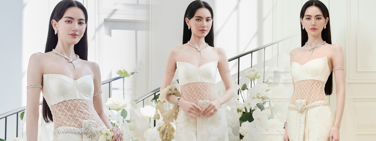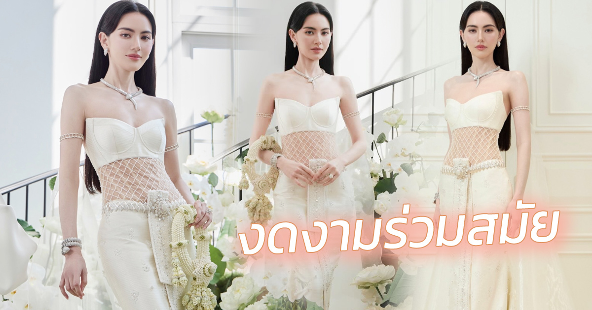 ในด้านดีไซน์ ชุดนี้ถูกออกแบบให้เป็นชุดไทยร่วมสมัยอย่างกลมกลืน ช่วงล่างของชุดเป็นทรงหางปลา ที่คงเอกลักษณ์ของการนุ่งผ้าแบบไทย แต่ให้ความพลิ้วและสง่างามในแบบโอต์กูตูร์ และชายผ้าปักด้วยเลื่อมเป็นลายดอกบัวดูหรูหรา ส่วนลำตัวออกแบบเป็นเสื้อเกาะอกโค้งคล้ายห่มสไบโบราณ เสริมด้วยผ้าไหมแก้วจากจังหวัดนครราชสีมา ตัดเย็บเป็นผ้าคลุมไหล่ยาวที่ยึดแนบกับต้นแขนอย่างอ่อนช้อย เข้ากับสร้อย Bvlgari และเครื่องประดับที่ออกแบบมาเพื่องานนี้โดยเฉพาะอีก 4 ชิ้น