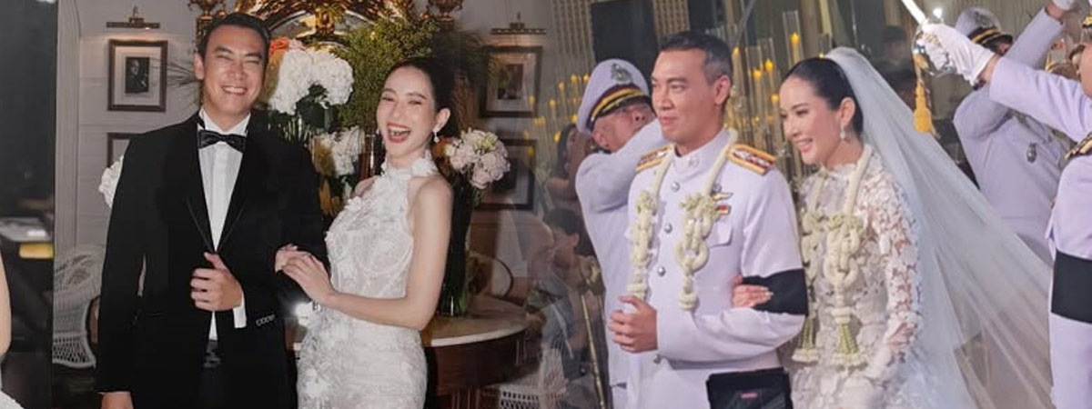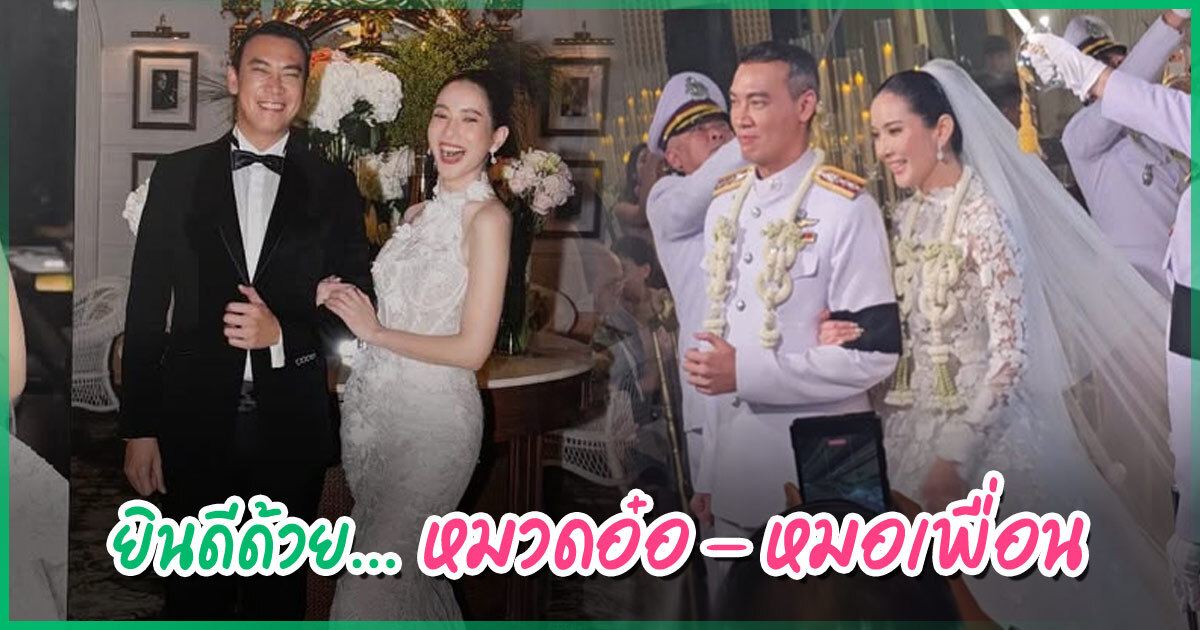 ทั้งนี้ บรรยากาศภายในงานงานของ หมวดอ๋อ และ หมอเพื่อน มีครอบครัว ญาติสนิท และเพื่อนทั้งในและนอกวงการร่วมมอบคำอวยพรอย่างคับคั่ง โดยวันนี้ หมอเพื่อน พญ.กอบกุลยา จึงประเสริฐศรี ปรากฏตัวในชุดเจ้าสาวเดรสยาวสีขาวฟูฟ่อง เพิ่มเสน่ห์ด้วยซีทรูลายดอกไม้ ให้ลุคหวานละมุนผสานความเซ็กซี่เล็กๆ ที่ดูงดงามลงตัว ขณะที่เจ้าบ่าว หมวดอ๋อ พ.ต.อ.รณกร รัตนะพร ก็โดดเด่นไม่แพ้กัน