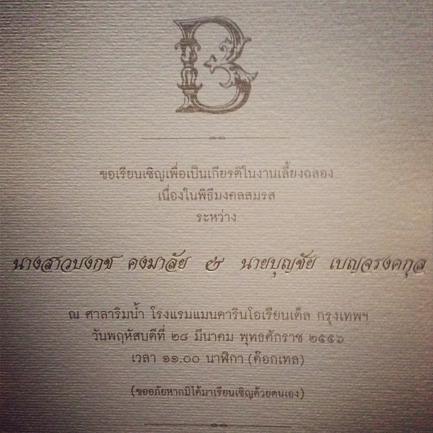 โดยล่าสุด ตั๊ก บงกช ก็ได้เผยภาพ การ์ดเชิญงานแต่งงานระหว่าง นางสาวบงกช คงมาลัย และ นายบุญชัย เบญจรงคกุล ออกมาแล้ว โดยงานเลี้ยงฉลองในพิธีมงคลสมรสของ ตั๊ก และเจ้าสัวบุญชัย จะจัดขึ้นที่ ศาลาริมน้ำ โรงแรมแมนดารินโอเรียนเต็ล กรุงเทพฯ ในวันพฤหัสบดีที่ 28 มีนาคมนี้